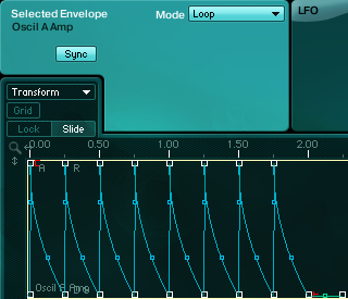 Above the ADSR section, we see the settings box for the selected oscillator. We need to change the mode from ‘sustain’ to ‘loop’, and activate the ‘sync’ option.
